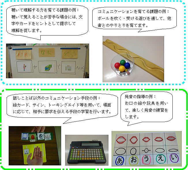 お子さんの発達や興味・関心にあわせて、ことばの指導・訓練、および、ことばに代わる手段の指導・相談・助言を行っています。