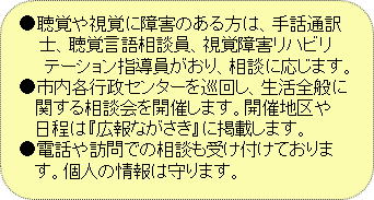 障害のある方やそのご家族の相談をお受けし、必要な情報の提供と、福祉サービスの利用についての支援などを行います。